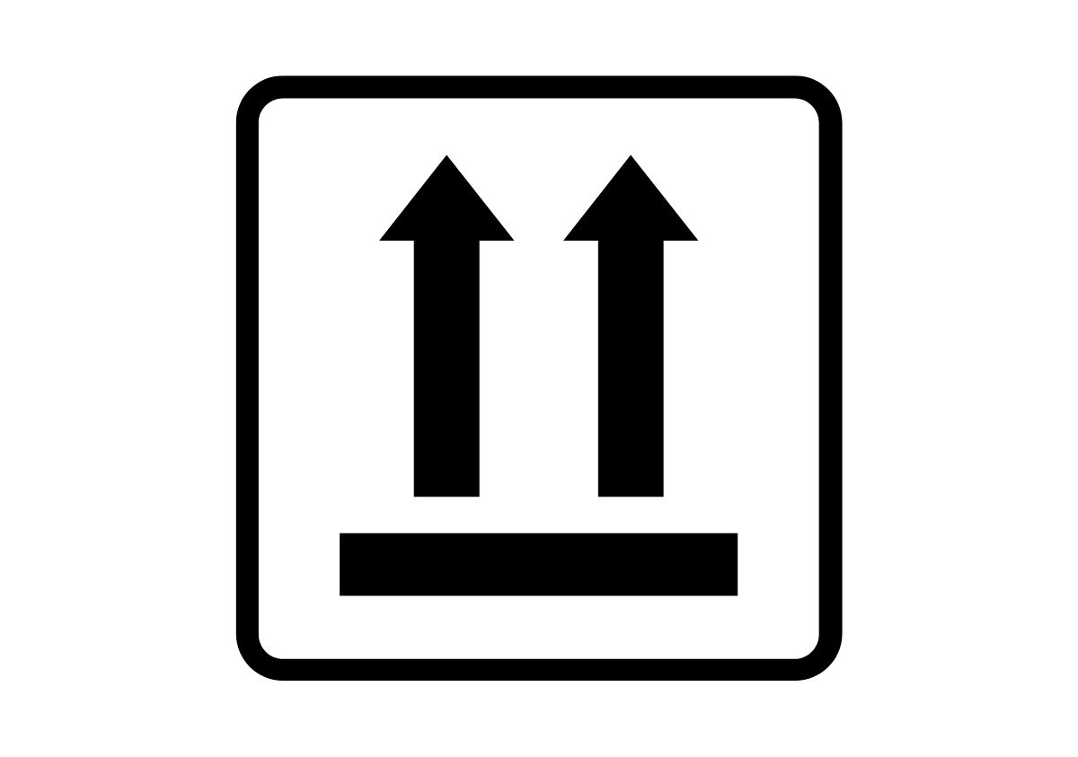 • สัญลักษณ์ This Way Up (ลูกศรชี้ขึ้น): มีลักษณะเป็นลูกศรสองด้านที่ชี้ขึ้น มักใช้กับบรรจุภัณฑ์ที่มีสินค้าซึ่งไม่สามารถกลับหัวได้ เช่น ขวดแก้วที่มีของเหลว หรืออุปกรณ์อิเล็กทรอนิกส์ที่มีส่วนประกอบละเอียดอ่อน เพื่อป้องกันความเสียหายที่อาจเกิดขึ้นจากการวางผิดทิศทาง