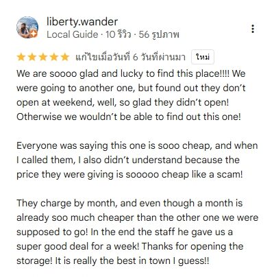 พวกเขาคิดค่าบริการเป็นรายเดือน และแม้แต่ราคาสำหรับหนึ่งเดือนก็ยังถูกกว่าที่อื่นที่เราตั้งใจจะไปมาก! สุดท้ายพนักงานก็ให้ข้อเสนอสุดพิเศษสำหรับหนึ่งสัปดาห์กับเรา! ขอบคุณที่เปิดให้บริการห้องเก็บของนี้! ฉันคิดว่าที่นี่ดีที่สุดในเมืองจริงๆ! ”